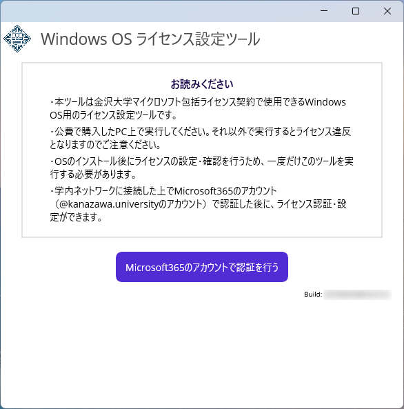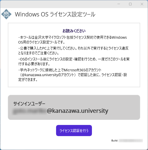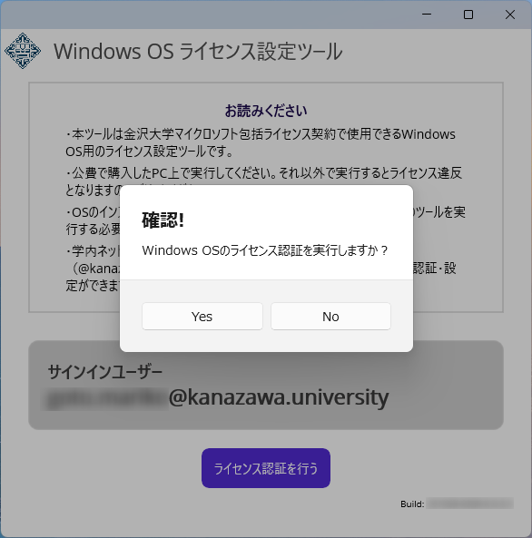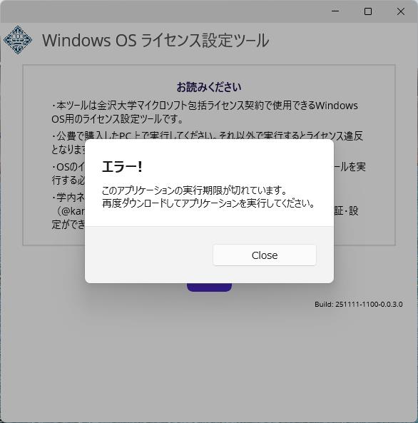 ※エラーになる場合は、表示内容の通り、再度WindowsOSライセンス設定ツールをダウンロードしなおしてください。https://www.emi.kanazawa-u.ac.jp/winos_license/#error