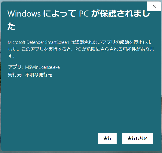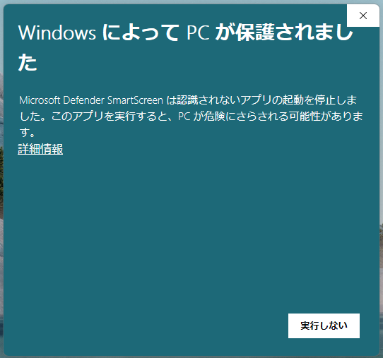 1. Webからダウンロードしたファイルを実行するとSmartScreenが表示されることがあります。「詳細情報」をクリックします。