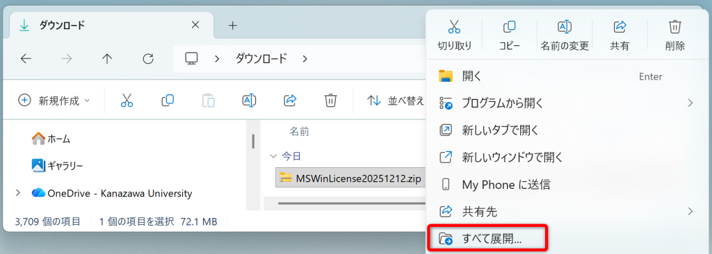 1. ダウンロードフォルダにダウンロードされたzipファイル(MSWinLicense*.zip)を展開します。